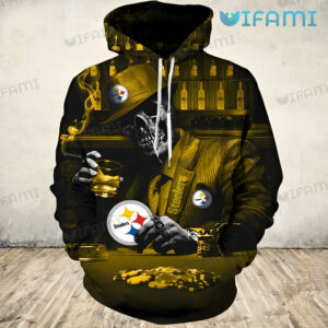Steelers Hoodie 3D Skeleton In Suit Playing Poker With Wine Glass Pittsburgh Steelers Gift