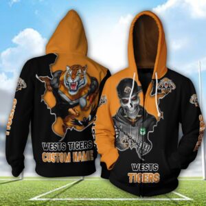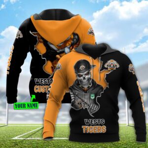 Personalized Wests Tigers 3D Hoodie Nrl 3D Hoodie Mascot Skull Personlaized Name 3D All Over Printed Hoodie