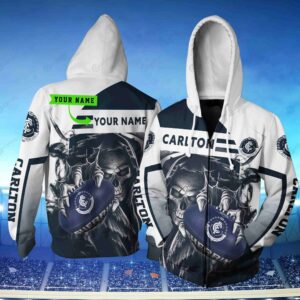 Personalized Carlton Football Club Afl Skull Ball New 3D Hoodie Custom Name 3D All Over Print Zip Up Hoodie Option