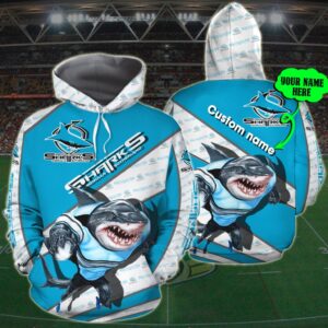 Personalized 3D Hoodie Cronulla Sutherland Sharks Vector Mascot Nrl Custom Name 3D All Over Print Zip Up Hoodie Option