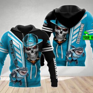 Personalized 3D Hoodie Cronulla Sutherland Sharks Nrl Skull Cap Custom Name 3D All Over Print Zip Up Hoodie Option