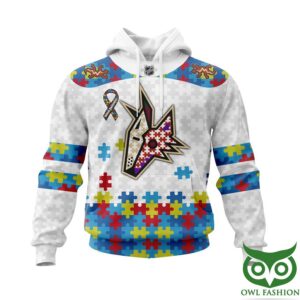 Customizable Autism Awareness Arizona Coyotes Hoodie With White Puzzle Design And Personalized Name And Number
