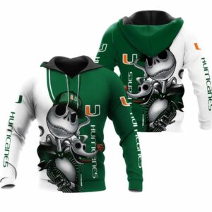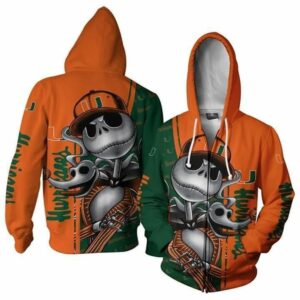 Miami Hurricanes Jack Skellington And Zero Halloween 3D All Over Print Zip Hoodie Gifts For Ncaa Fans